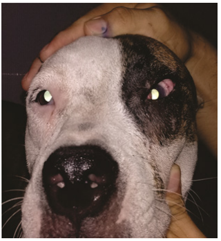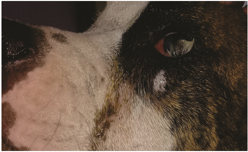 A one-and-a-half-year-old female American Bully canine patient, a one and a half year old female, presented to the HOVET Small Animal Hospital practice. For the evaluation of the presence of a type of tissue with abnormal hair in the left eye (LE), accompanied by chronic epiphora, with hyperemia, and with bilateral uveitis. On physical examination and physiological findings, respiratory rate 24 bpm, heart rate 90bpm, capillary return time 2s, pink mucosa color, SBP 120mmHg, DBP 60mmHg, and temperature 38.8˚C. They were within normal values.