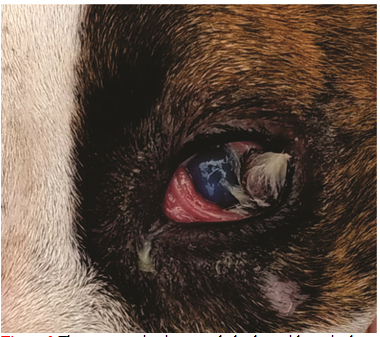 Removal of the dermoid was by surgical removal. The incision was made around the periphery of the dermoid, starting at the limit of the lateral palpebral conjunctiva, and towards the bulbar conjunctiva near the corneascleral limbus.2 The excision was continued bordering the dermoid from lateral to medial with a linear incision with the help of a curved mosquito hemostat, to achieve complete excision of the dermoid. On the other hand, it was observed that it invaded the stromal layer of the cornea and encompassed the limbus of the cornea and the sclera. All dermoid tissue was removed. LaterThis was followed by closure with a discontinuous 4-point suture. With absorbable 6-0 polyglycolic acid thread. For good post-operative management, an Elizabethan collar was put on to prevent the dog from contacting the eye (Figure 3).