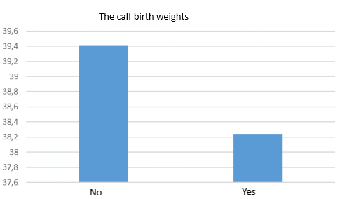 Looking at Figure 2, which shows the birth weights of calves that experienced and did not experience diseases, it is evident that the birth weights are 38.24 kg and 39.41 kg (Figure 2), with a difference of 3 kg between those that experienced diseases and those that did not.