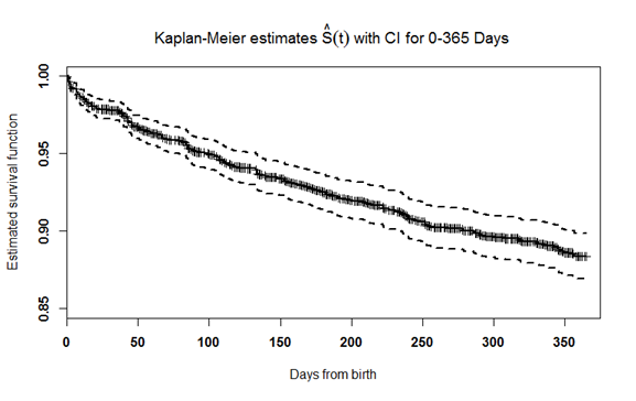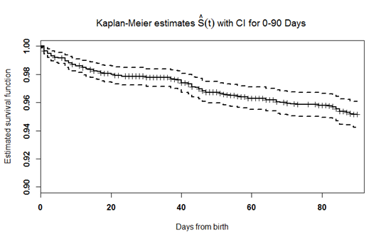 The survival function for the three periods was estimated using Kaplan-Meier Method and is given in Figure 1-3. The survival curve estimates the probability of mortality at particular day. The line marking on the survival curve indicates the censored lambs and outer dotted lines represent the confidence interval for estimated survival function.
