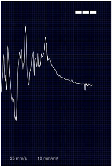 Physical examination revealed the whether to be tachycardic (115 beats per minute, normal: 70-90) with decreased ruminations and a “hunched” abdominal posture. Digital rectal examination revealed the presence of urethral spasms. Ultrasound of the abdomen demonstrated a markedly enlarged urinary bladder (10.5 cm diameter; normal reference range <6 cm). Due to concerns of obstructive urolithaisis from the physical examination a point of care serum biochemistry examination was performed. Bloodwork showed an animal that was azotemic, as well as markedly hyperkalemic (Potassium: 9.2 mEq/L; reference range 4.2-6.2 mEq/L). The ECG was collected caudal to the left elbow as previously reported.3,4,6 The area was clipped of hair, and then a small amount of isopropyl alcohol was applied to the skin to improve contact. This proved to be too much, as the resulting image was indecipherable (Figure 1). The area was dried, and a small amount of ultrasound gel was applied to the skin to facilitate contact. This image was of diagnostic quality (Figure 2). The patient’s urinary obstruction was relieved with a percutaneous suprapubic catheter as previously reported.12 After twenty-four hours of fluid therapy the urinary obstruction was relieved via a tube cystostomy procedure and the animal was discharged from the hospital ten days postoperatively.