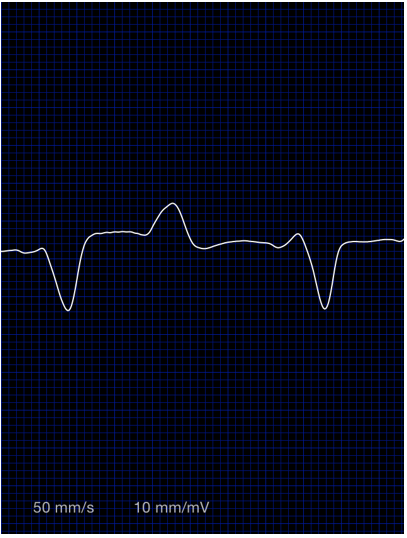 The absence of P waves on an ECG is a common occurrence of hyperkalemia.11 Initially tall or “tented” T waves can be present, and then as the potassium concentration increases P waves can disappear entirely.15 This increase in potassium can ultimately lead to the depolarization of the membrane potential of cardiac cells and lead to fatal arrhythmias.15 Fortunately for our patient, the relief of urinary obstruction and fluid therapy allowed for a reduction in serum potassium levels. Most of the large animal veterinary literature demonstrates the use of smartphone-based ECGs for the determination of normal sinus rhythms, as has been demonstrated in cattle,3 goats,4 and water buffalo calves.6,7 The next step for determining the utility of this diagnostic approach would be the use for the real-time diagnosis of altered ECGs. This has been proven effective in people16 for the monitoring of supraventricular tachycardia17 and palpitations;18 as well as in dogs.19 This case report demonstrates primary feasibility for the determination of altered ECGs in sheep with a smartphone-based ECG monitor. Future studies should examine large populations of sheep for determination of validity of this device on a population basis.