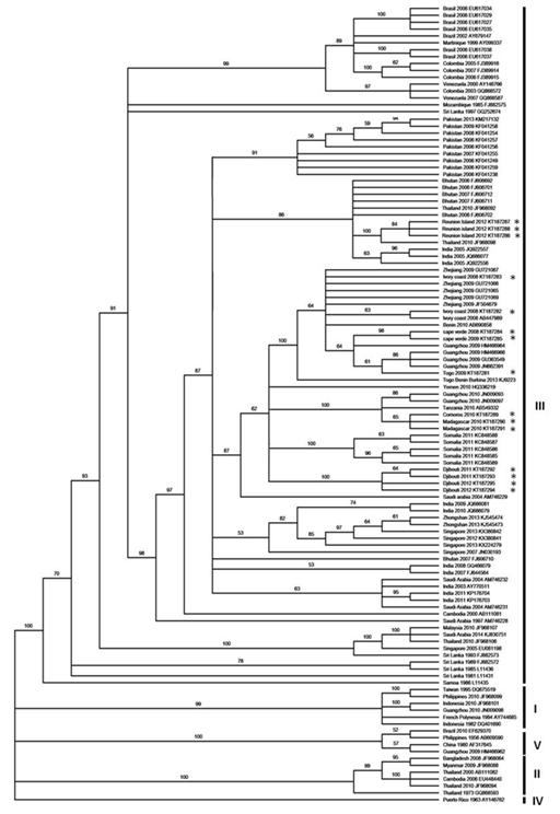Figure 1 Phylogenetic tree of 116 DENV-3 strains based on E nucleotidic sequence (1-1479) using the Maximum Likelihood method based on the General Time Reversible + I + Γ model. Strains isolated in our laboratory, identified by *, belong to the genotype III. Node values were determined for 1,000 replicates. Branch lengths are correlated to the number of substitutions per site. Isolates are labeled as follows: country, date of isolation, genbank accession number.