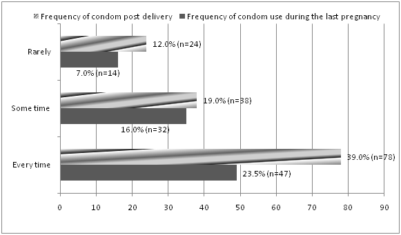 Although 7.0% (n=14) of the current study’s 200 respondents had rarely used condoms during pregnancy, 12.0% (n=24) rarely did so after their babies’ births. Condoms were used sometimes during pregnancy by 16.0% (n=32) of the respondents and by 19.0% (n=38) after their babies’ births. Respondents who used condoms at every sexual encounter during pregnancy were 23.5% (n=47) during pregnancy and 39.0% (n=78) after their babies’ births. Thus regular condom use seemed to increase after the respondents’ babies had been born (Figure 1).