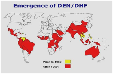 During the 1950s, 1960s, and most of the 1970s, dengue epidemic was rare in most of South and Central America because the primary mosquito vector, Aedes aegypti, was eradicated. However, once the eextermination was stopped, Aedes aegypti began to reinvade those regions. In 1997, Aedes aegyptiand the dengue virus gained a worldwide distribution again,3 (Figures 1,2).According to WHO,there are now over 2.5 billion people who live in areas where dengue/DHF is endemic and are at risk for being infected with the dengue virus.1 Several factors contribute to the viral transmission by Aedes aegypti; including temperature, rainfall, rural-urban migration, population growth, stored water, increase solid waste which allows for larval habitats for the vector.8 There can also be outbreaks of travel-associated DHF. Dengue fever is the most widespread arbovirus infection worldwide.9
