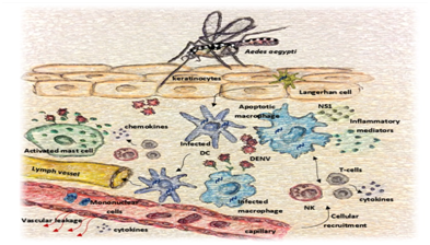 Figure 3 After being bitten by the carrier Aedes aegypti mosquito, immature Langerhans cells and keratinocytes are infected with DENV. The infected cells then move down into the lymph where macrophages are recruited.15 From here the infection is disseminated into various organs, including the liver, spleen and bone marrow. Necrosis of the bone marrow by DENV can lead to suppression of hematopoietic and decreased thrombogenesis in the blood.18,19 The inflammatory response, caused by chemokine and cytokine release from mast cells, macrophages, and lymphocytes causes increased vascular permeability, platelet dysfunction, and thrombocytopenia and plasma leakage.18 Though the mechanism is not well understood this cascade also appears to cause spontaneous bleeding, leading to the clinical manifestations of petechiae, gingival bleeding, and gastrointestinal hemorrhage.18
