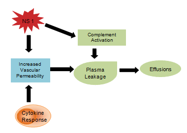 Mast cells have also been implicated in the pathogenesis of DHF. In some cases, mast cells appear to provide a protective function where anti-viral molecules are released by de granulation and other immune cells, such as T-lymphocytes and natural killer (NK) cells are recruited, all of which help to neutralize the virus.20 However, in other cases, local control mechanisms cannot contain the virus, and it travels through the bloodstream or lymphatic system to activate mast cells in other organs such as the liver, spleen and lymph nodes.19 When de granulation occurs in these organs, proteases are released and inflammatory mediators, such as leukotrienes and vascular endothelial growth factor (VEGF), are synthesized, increasing the permeability of capillaries, and leading to plasma leakage.20 This is important as different groups of mast cells release distinct mediators during the de granulation process.20 The virus-antibody complex, perhaps through the NS1 antigen of the dengue virus, and cytokine production also results in complement activation. The release of C3a and C5a fragments are known to increase vascular permeability and thus contribute to plasma leakage.18