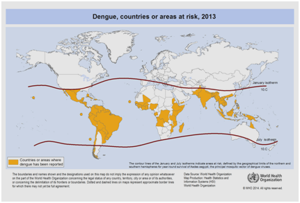 Figure 5 Countries or areas of the world where dengue was reported in 2013, as per data collected by the World Health Organization.41