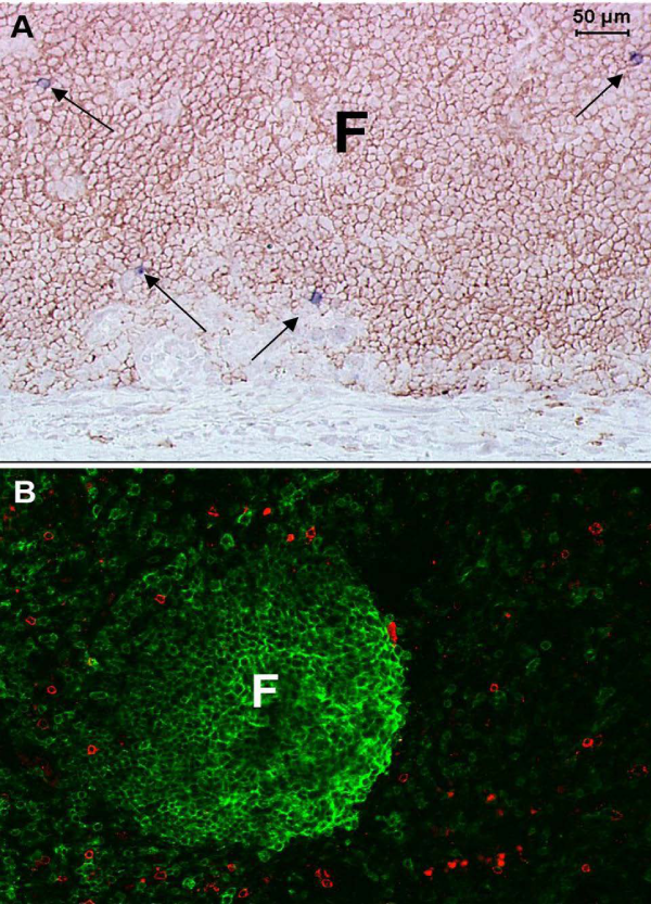 Figure 1: In lymph nodes from untreated HIV-1-infected individuals, virus replication is largely concentrated inside B cell follicles, whereas HIV-1-specific CD8+T cells fail to accumulate at those sites. A) HIV-1 RNA+ cells identified by in situ hybridization (blue-black staining cells indicated by arrows) are located primarily inside of a B cell follicle, defined morphologically by staining with anti-CD20 antibodies (brown). B) HIV-1-specific CD8+T cells labeled in situ with HLA-tetramers (red) are concentrated primarily outside of a B cell follicle, defined by anti-CD20 antibodies (green).
