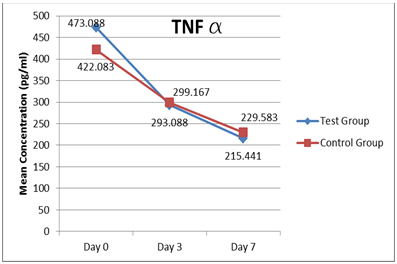 Figure 2 TNFα Levels: Levels decrease over 7 day study period in both the study groups with levels being maximum at presentation and minimum at day 7. This intra‒group difference is statistically significant with p‒value <0.001.
