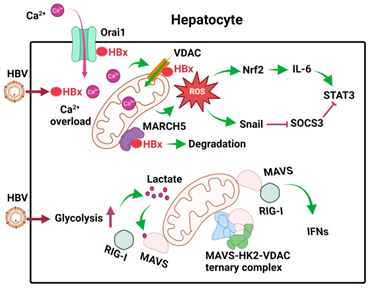 Figure 2 Courtesy ref no-3-Effects of HBV on mitochondrial metabolism in hepatocytes. After the infection of hepatocytes, HBV expresses its HBx protein, which binds to Orai1 to promote the uptake of Ca2+, which then enters mitochondria to cause calcium overload and activate calcium signaling. HBx also binds to VDAC to induce ROS. MARCH5, an E3 ubiquitin ligase, binds to HBx to promote its degradation. HBV also induces glycolysis in hepatocytes to generate lactate, which binds to MAVS on mitochondrial membranes to disrupt RIG-I signaling. In addition, HBV also promotes the formation of the MAVS-HK2-VDAC ternary complex to prevent MAVS from interacting with RIG-I. The ROS produced by mitochondria induces the expression of Nrf2 to induce the expression of IL-6 and activate STAT3. It also induces the expression of Snail to inhibit the expression of SOCS3, an inhibitor of STAT3. These effects of ROS lead to constitutive activation of STAT3 and cell proliferation.