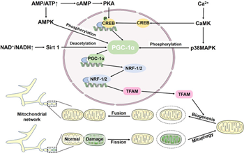 Figure 5 Courtesy ref no-74-Mitochondrial biogenesis and mitophagy jointly maintain mitochondrial homeostasis. Mitochondrial biogenesis is regulated by the PGC-1α-NRF-1/2-TFAM pathway. Elevated AMP activates AMPK, which directly phosphorylates PGC-1α, increasing expression of PGC-1α and TFAM. In addition, AMP can be converted to cAMP, which regulates PGC-1α through the cAMP-PKA-CREB pathway. Ca2+ stimulates CaMK to phosphorylate p38 MAPK. Additionally, CaMK can stimulate PGC-1α via CREB. In response to NAD+, Sirt1 deacetylates PGC-1α to activate PGC-1α.