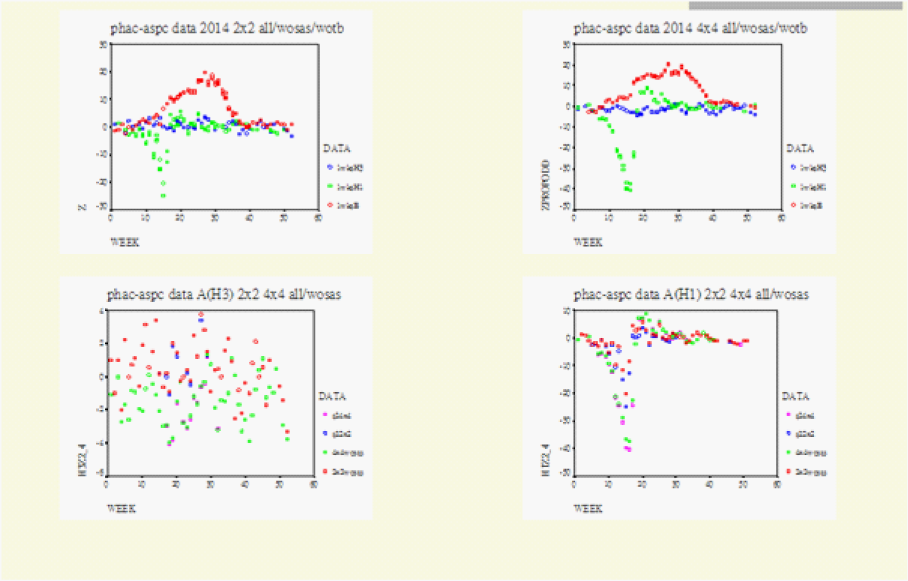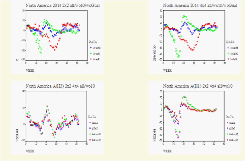 On Figure 1-3 for Canada, Figure 4 for the US, Figure 5 for North America, Figure 6 for Europe/Asia, and Figure 7 for the Southern Hemisphere, we tested the matched-pair model generally with the standardized normal test statistic z of the McNemar’s Test on the upper left and compared this with the approximate z based on the Proportional Odds Model on the upper right. On the lower row within each graph we superimposed the 2x2 (2wk) and 4x4 (4wks) Tables to compare their real-time differences, A(H3) on the lower left and A(H1) on the lower right .