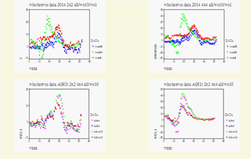 For the major part of the Season A (H1N1) appeared to have positive symmetry coefficients. The symmetry coefficients for A (H3N2) appeared less positive and they seemed to be catching up with a steeper slope. At the end of the Season all the coefficients were converged together. This was the year when the hybrid A (H1N2) was reported.