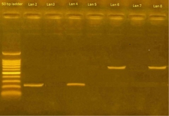 Lan 6 and 8: Shows 450 bp of HPV.