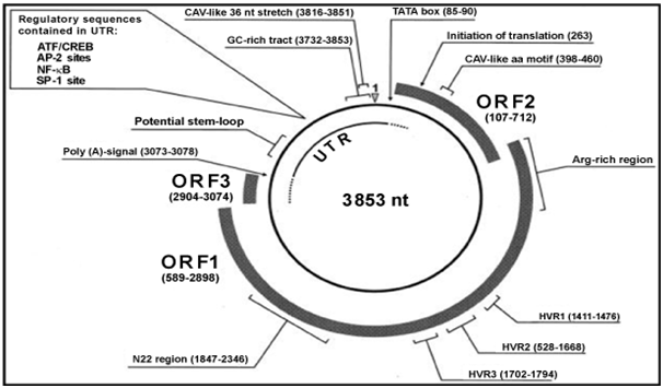 TT virus genomic size varies among isolates. Approximately the genome is about 3.8kb.2 with a diameter of around 30-50nm. The genome has a coding region of approximately 2.6kb and an untranslated region (UTR) of 1.2kb. It contains a GC-rich region of about 120 nucleotides which is present in all isolates.2 The genome has three large open reading frame (ORF) which encodes proteins with 770, 202 and 105 amino acids.3 The ORFs encoding TT virus proteins are located in the complementary DNA strand, the plus strand. Despite TT virus sequence variability among isolates, the ORF1 is found in all isolates and encodes a capsid.4 The ORF1 sequence varies at the amino acid level among TT virus isolates with an amino acid differences of about 50-70% in these isolates.5 These are not uniformly distributed since ORF1 contains hypervariable regions (HVRs) where mutation occurs (Figure 1).6 It was believed that TT virus could escape immunological responses by mutating this HVRs.7