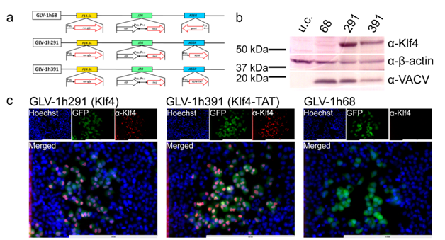 GLV-1h291-infected cell lysates showed no reduction in proliferation. Conditioned media containing mock-infected or GLV-1h68-infected cell lysates also had no effect on cell proliferation. These findings strongly indicate the functionality of the TAT transduction domain fused to the Klf4 in enabling the transcription factor to enter cells by passage through the cytoplasmic membrane and initiate cell growth arrest.