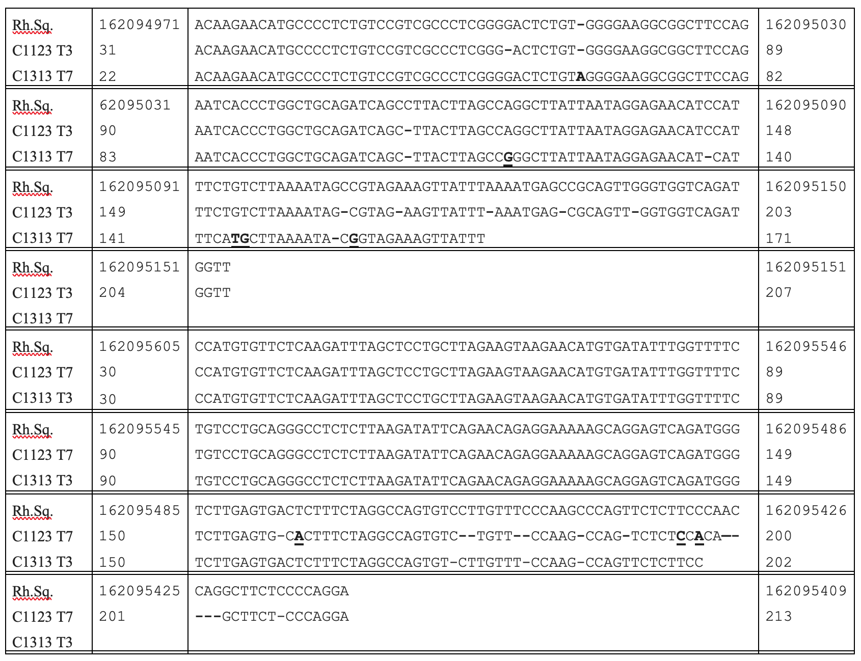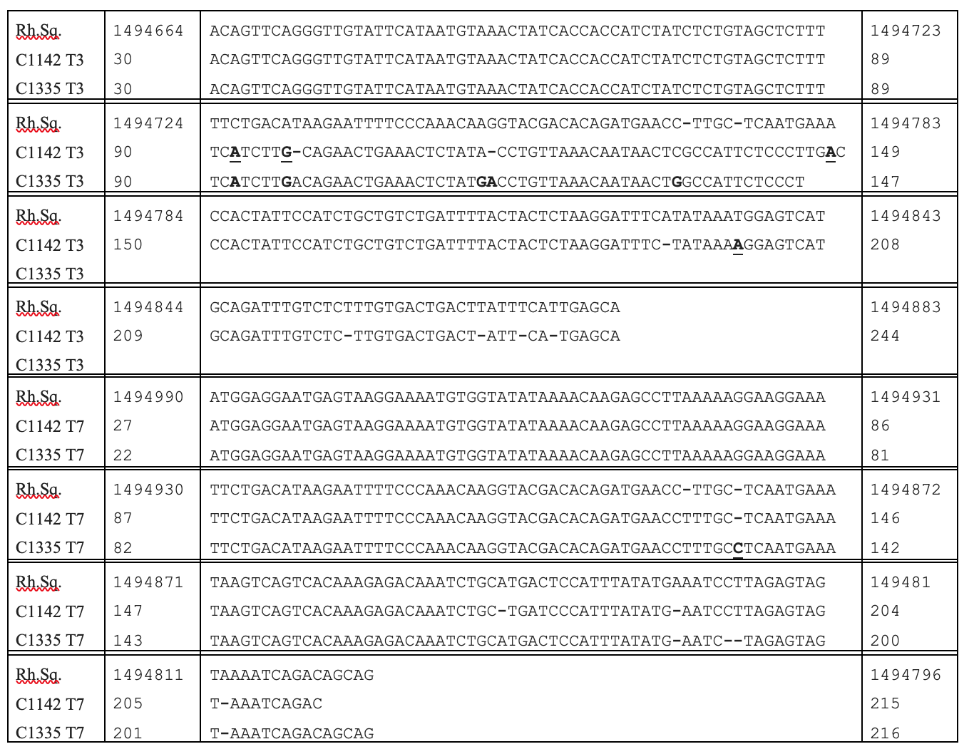 The T3 and T7 readouts from another of the clones from the culture of stealth virus-4 (C1123) matched to the same region of the rhesus monkey genome as did clone (C1313) from stealth virus 5. Figure 2 compares the sequences of the originating rhesus monkey genome with the T3 and T7 sequences of these two matching clones. Similarly, the T3 and T7 readouts from another of the clones from the culture of stealth virus-4 (C1142) matched to the same region of the rhesus monkey genome as did clone (C1335) from stealth virus-5. Figure 3 compares the sequences of the originating rhesus monkey genome with the T3 and T7 sequences of these two matching clones. The data displayed in Figures 2 and 3 again indicate occasional minor nucleotide additions, deletions, and substitutions.
