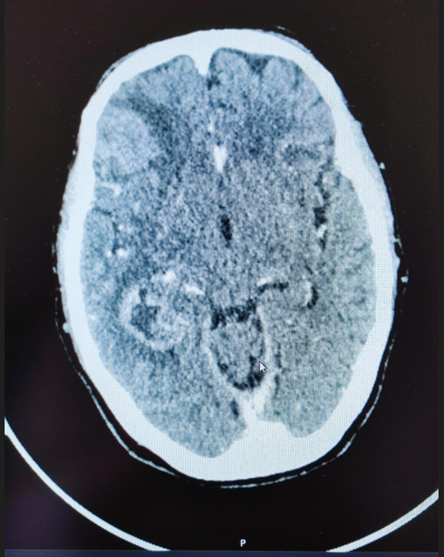 Cranioencephalic computed tomography revealed an expansile cortico-subcortical lesion predominantly centered in the right medial temporal lobe, with significant extension into the adjacent parietal and frontal lobes. The lesion demonstrated heterogeneous contrast enhancement and was surrounded by notable perilesional edema, contributing to local mass effect (Figure 1). A lumbar puncture was performed to analyze cerebrospinal fluid, effectively excluding infectious or lymphoproliferative causes.