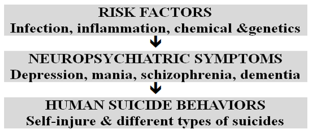 Accumulated events suggest that human suicide behavior is not impulsive and random. It is possibly a disease-related process. After two decades of persistence analysis, many different types of human diseases are associated.13–18 To attain management gains, it should first know the complex natures of suicide (etiological features, pathogenesis cascade and therapeutic linkage). However, this kind of scientific researches should be translated onto genetic, molecular or multiple-omics discoveries in molecular diagnosis.