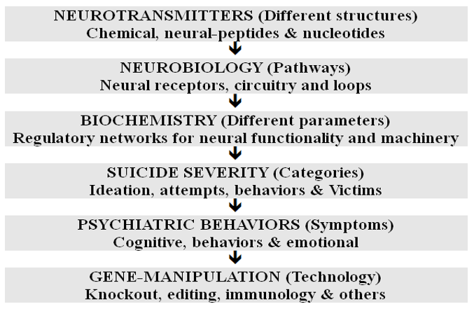 To update knowledge, several biological foundations between genetic predisposition, molecular dysfunctions, neural circuitry disconnection will be evaluated by drug targeting in statistically significant manner. Based on biological studies, variable risk factors would be identified in the future.17 In this article, suicide prediction and prevention in molecular bases are addressed.