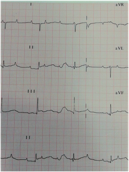 A late preterm 36weeks’ gestation female infant was delivered by caesarian section to a P3+0 32-year old woman with an uneventful pregnancy, except for fetal bradycardia with ventricular rate of 57bpm on antenatal scan. Fetal echocardiography before birth confirmed the diagnosis of CCHB and normal cardiac anatomy. The mother was completely asymptomatic; however, screening for possible maternal autoimmune diseases was done based on the antenatal scan. Maternal anti-extractable nuclear antigen (ENA) profiles, including the levels of anti-ribosomal P (Rib-P-protein), anti-smooth muscle, anti-Smith (for SLE), anti-ScL-70 (anti-topoisomerase for scleroderma), and ENA Jo-1(for dermatomyositis) antibodies were less than 0.1 U (negative<0.7 U). Only the anti-Ro/SSA antibody level was 5.78U (positive>1U), while the anti-La/SSB antibody level was 0.137U (negative). The Apgar score was 5 and 9 at 1 and 5min, respectively, and only T-piece resuscitator support was needed for labored breathing. On examination, the birth weight was 2.775 (50th centile); head circumference, 35 cm (50th centile); and length, 50 cm (50th centile). The infant was maintaining saturation on nasal continuous positive airway pressure support with acceptable blood gases; no dysmorphic features and no skin stigmata were observed. Chest examination showed mild subcostal recessions with respiratory rate of 40 -50/min. Heart rate ranged from 60 to 65bpm with grade II systolic murmur over the left upper parasternal border. Femoral pulses were palpable with mean blood pressure of 50-55mmHg in both upper and lower limbs. The liver was palpable about 3 cm below the right costal margin but not tender. The spleen was also enlarged 2-3cm below the left costal margin. Chest X-ray on admission revealed mild cardiomegaly with plethoric well- inflated lung fields (Figure 1). The patient was reviewed by the pediatric cardiology team, and the ECG indicated CCHB with complete PR dissociation (P-P rate 150bpm and R-R rate 57bpm) (Figure 2). Echocardiography showed small PDA, LA/Ao 1.0, functional MR, functional TR, and mild pulmonary hypertension, with dilated right heart.