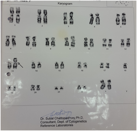 A 8year old girl born to non consanguineous marriage reported to the outpatient department (OPD) with history of acute pain abdomen of 3days duration, speech delay, global developmental delay and squint since birth. She was born at 37weeks of gestation by emergency Lower segment caesarean section LSCS (Indication fetal distress) with birth weight 2.25kg, length 45cm and head circumference 34cm. The baby cried immediately after birth and was started on breast feeds within 4hrs of birth. There were no antenatal risk factors. The initial milestones was delayed (cognitive more than motor). There was history of recurrent lower respiratory tract infection since 2yrs of age which required frequent hospital admission and antibiotics. She developed seizure at 5yrs of age which was managed with anticonvulsant. The MRI (Brain) done at this stage revealed small foci of hyperintensity in T2 weighted image in frontal and parietal region. The EEG was normal. There was no family history of any chromosomal disorder. She was the eldest sibling and other siblings were 3 and 5years old normal for age. Presently she was brought with history of acute abdomen pain on right upper abdomen which was colicky associated with fever with chills and vomiting. The clinical evaluation revealed weight 21kg (5th P) and height 120cm (3rd P) and head circumference 51cm. The Dysmorphic features were doliocephalic head, hypertelorism, Squint, flat bridge of nose, high arched palate, wide spaced nipple, prominent forehead and microcornea on right side and everted umbilicus (Figure 1A & 1B). The vital parameter revealed temperature 102degree Farenheit with pulse 110/min, respiratory rate 30/min, blood pressure 110/70mm Hg. The abdominal examination revealed marked tenderness over right hypochondriac region and other system was essentially normal. She was immediately admitted and was started on IV fluids and antibiotics and sample was sent for complete blood count, biochemistry and was planned for sonography of abdomen. The investigation revealed polymorpho lecucocytosis with normal biochemistry with positive CRP. The thyroid profile was normal. The ultrasonography revealed multiple Gall bladder calculi with largest measuring 18mmx 19mm (Figure 2). The gall bladder was distended and Common bile duct (CBD) was normal. The lipid profile was normal. The Chest radiograph was normal. She was managed with antibiotics and IV fluids and she responded well to conservative management. The Karyotyping (Figure 3) was done in view of dysmorphism and developmental delay which revealed monosomy 18 with translocation 13p 11/18 which was later confirmed by FISH. The hearing assessment test was normal. The Eye evaluation revealed concomitant squint. The Intelligent quotient test revealed score of 60. She was planned for speech therapy and was kept under follow up.