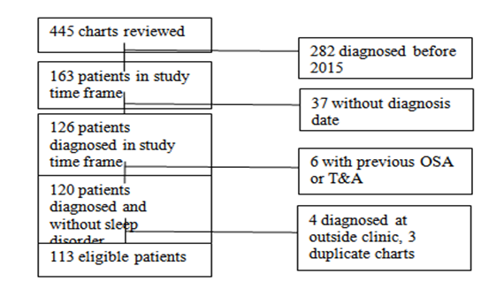 Patient flow is illustrated in (Figure 1). 445 unique patient charts were reviewed. 282 patients were diagnosed with ADHD prior to the study time frame. 37 did not have a record of their diagnosis in the electronic medical record, suggesting their diagnostic encounter was completed on paper charts prior to the clinic transitioning to electronic medical record keeping. 4 patients had a previous diagnosis of OSA. 4 patients were diagnosed at an outside, non-affiliated clinic. 2 patients had previous adenotonsillectomy. There were 3 duplicate charts. After these exclusions, 113 patients qualified for inclusion in the study.