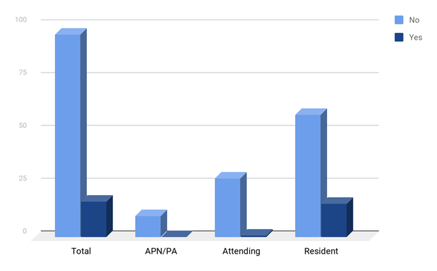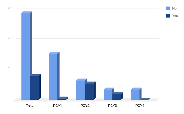 Multivariate analyses were also conducted on several different clinician characteristics. Providers were compared based on level of training, whether attending level, PA, APN, or resident (Figure 2). The resident physician groups were also separated out by number of years in training (Figure 3). Of the 10 patients seen by an APN or PA, none were screened for snoring. Of the 29 patients seen by attending physicians, 1(3%) was screened for snoring while 28 were not. Among the resident group, 16 of 74 patients (22%) were screened for snoring (P=0.029). Further categorization of these groups into resident physician vs non-resident physician (attending, PA, APN) revealed that only 1 patient (3%) was screened for snoring among the non-resident group, as compared with 16 patients (22%) in the resident group (P=0.007). The resident physician group was also further investigated based on number of years in training. Of the 74 patients seen by resident physicians, 32(43%) were seen by first year residents, 24(32%) by second year residents, 11(15%) by third year residents, and 7(10%) by fourth year residents. First year residents screened for snoring in 1 patient (3%); second year residents in 11 patients (46%), third year residents in 4 patients (36%), and fourth year residents in no patients (P=<.001). Bivariate analyses were conducted on the progression between each resident year, with the second-year residents more likely to screen for snoring compared to the first-year residents (P=<.001). Screening between second and third year residents and third and fourth year residents was not statistically significant.