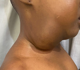 Two-week-old female newborn seen in consultation for congenital right side-cervical mass. The examination reveals an unremarkable gestational history with good monitoring of the pregnancy and a full-term vaginal delivery. We find a hard, multilobulated right side-cervical swelling that is mobile in relation to the deep and superficial planes without satellite lymphadenopathy (Figure 6). An ultrasound is performed of the mass which reveals a hyper-vascularized right side-cervical lymph node cluster in a well-defined agglomerate measuring approximately 21.4 x 22.9 millimeters. Blood alpha-fetoprotein was very high at 9684.80 ng/ml (normal < 15 ng/ml). We concluded that it was a laterocervical teratoma and the infant was taken to the operating room for one-piece surgical excision of the tumor. Pathological examination of the surgical specimen concluded it was a mature multi-tissue teratoma. The postoperative course was simple with normalization of alpha-fetoprotein at 9 months postoperatively.