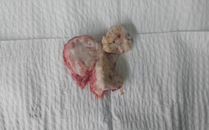 The management strategy for giant cervical teratomas differs: most authors opt for a cesarean section from the outset regardless of the size of the tumor from 36 weeks.12 The intervention is scheduled as a delayed emergency after stabilization and conditioning of the newborn. Ex utero intrapartum treatment (EXIT) represents an alternative.13,14 As soon as the uterine cavity is opened, nasotracheal intubation or tracheotomy is carried out depending on the size of the mass and its impact on the airways. Clamping of the cord only takes place if a free airway has been ensured. Surgical treatment of these tumors must be early because of the risks of respiratory distress and degeneration.11 The pathological examination is the only examination which allows the diagnosis of teratoma to be made with certainty. The assessment will be completed by the alpha-fetoprotein dosage, which will be repeated after tumor excision.8,15 When tumor markers such as alpha-fetoprotein and bHCG (b human chorionic gonadotropin) are abnormal, this affirms the presence of a malignant secreting component in the teratoma even if it is not found by the pathologist.16 The non-existence of antenatal diagnosis and the late recourse to care in our work context requires emergency treatment.of the case upon consultation. The pathological examination carried out on the surgical specimen concluded that it was a mature teratoma without signs of malignancy corroborated by the alpha-fetoprotein dosage who is negative income in both cases.