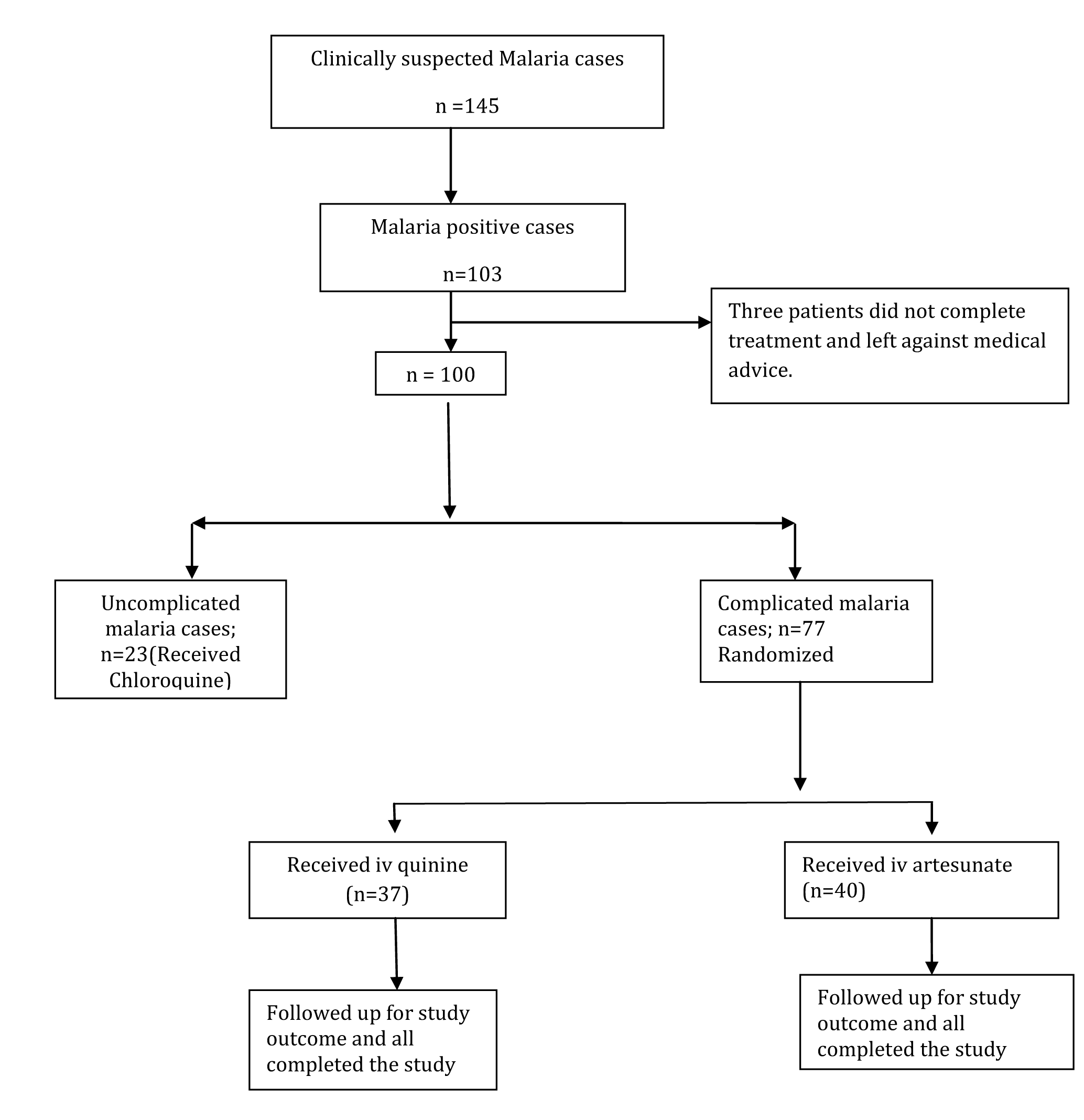 All cases with proven malaria (103 patients) were admitted and included in the study. Three patients dropped out from the study as they went home against medical advice for personal and family reasons. A total of 100 cases completed the study.