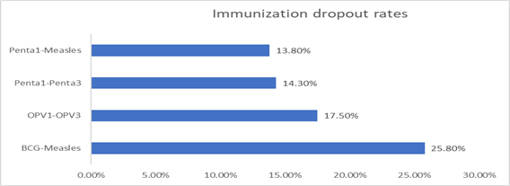 High dropout rate was observed across all the immunization strata, as illustrated in Figure 5. The dropout rate of Penta 1 to Penta 3 was (14.33%), OPV1 to OPV 3 (17.5%) and BCG to MCV was 25.8%. The highest dropout rate was observed in BCG to measles vaccine coverage with 25.8%, followed by OPV1 to OPV3 with 17.5%, then Penta1 - Penta3 (14.3%) and the least was penta1 to measles with 13.8%. One of the questions asked to KIIs was “What are some of the reasons that contribute to incomplete vaccination status of children?” One of the KII (Epi nurse SCHMT member) said, “Stock-outs of antigens (i.e BCG, MR and OPV), stock-outs of immunization devices, missed opportunities, lack of defaulter tracking mechanisms at health facility and cold chain breakdown” (Table 1).