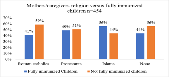 Results: The total number of mothers/caregivers who were interviewed were 454, with a response of 100%. Results of immunization coverage; BCG 73%, OPV1 59%, OPV2 51%, OPV3 49%, Penta1 58%, Penta2 51%, Penta3 50%, Measles 54% and Fully Immunized Children 47%. Further, 47% of the children in the sub-county were fully immunized and 53% were unimmunized. The SD mean for mothers/caregivers and children 31.4 and 17.0 respectively and over 70% of the mothers/caregivers had no formal education. There were significant association predictors with immunization coverage included maternal education (X2 =11.75, df=4 p value=0.02), distance to health facility (X2 =62.30, df=2 p value=0.00), also, there was strong significant association with childbirth ranking (OR=1.218, p value=0.04). Bivariate analysis, there was an association with mothers/caregivers’ who had more than one visits with fully immunized children (χ2=13.54, df =2 and p value =0.001), source of the immunization information OR=0.75 and p value=0.02 and, ultimately, there was association between mother’s/caregiver place of delivery with non-fully immunized children (X2=74.40,df=1 p value=0.01). Predictors of non-fully immunized children in the study population were; place of delivery, family size, education level, source of income, none attendance of Antenatal clinics, distance to the health facility, source of the vaccination information was associated with incomplete fully immunized children.
