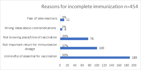 Slightly over fifty percent of the mothers/caregivers showed being unmindful of essentials for vaccination, this means that majority of mothers don’t mind returning their children for second or third vaccine doses. Most respondents during focus group discussion said that they only know of BCG and measles vaccines. In fact, on the of the mothers said “mtoto akishapewa chanjo ya mkono na miguu, tunajua chanjo imekwisha”. (If a child has been given BCG and measles vaccines, then the child has completed immunization). Other respondents said they feared side effects and they had no faith in immunizations. Regarding to KII, most of the respondents seemed to concur with mothers who said that, they only know of BCG and measles vaccine. Furthermore, majority 42% of caregivers/mothers mentioned that health facilities for offering immunization services was too far. Majority of respondents who reside close to health facility were 15 times likely to have their children fully immunized compared to those who travelled or walk more than one hour to the nearest immunization facility. So, distance to the health facilities was associated with incomplete vaccination of children (χ2=62.30, df=2 and p value=0.00). This finding was consistent with other studies conducted by Kiptoo, Dikiema et al.,11 and Wado et al,.33 pertaining to distance to near health facilities offering immunization services. Further, most the respondents a long Loita are Naroosura /Maji Moto are nomadic pastoralist, thus the immunization coverage was low because most of the mothers/caregivers had relocated for grazing. This was also supported by both key informant interviews (KII) and focus group discussants (FGDs) who agreed that, during dry seasons most residents relocate to look for greener pastures in the neighboring county Tanzania, hence children missed out on second and third doses of vaccine.
