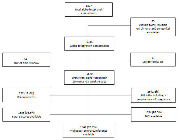 The information we obtained was under the auspices of SPS. Participants for the South African arm of the study were recruited at the antenatal clinic of the Bishop Lavis Community Health Centre, the primary health care centre for a low to middle class community. All study assessments at 20 weeks 0 days to 23 weeks 6 days (20°-236), 28°-316 and 34°-376 weeks’ gestation were performed at Tygerberg Academic Hospital, Cape Town, South Africa. Recruitment for this prospective study began on 1 August 2007 and collection of blood for MSAFP was discontinued on 13 June 2011 (to limit the expenses of the study). A total of 1,679 singleton pregnancies, with MSAFP determined at 20°-236 weeks (the first SPS study visit) and known birth outcome, were included for this analysis (Figure 1). Gestational age (GA) was determined by ultrasound at the first antenatal visit or just before the second visit.23 After the recruitment interview, a trained midwife measured the weight, height and mid upper arm circumference (MUAC) of the participant and calculated the body mass index (BMI in kg/m2). A regularly calibrated high quality scale was used to determine weights after participants took off their heavy clothes, shoes and head dresses. A Seca stadiometer® (Baseline Scales and Balances (Pty) Ltd, 11 Wimbledon Road, Edgemead, 7447, Cape Town, South Africa), fixed against the wall, was used to measure the height. For the MUAC the midpoint between the acromion of the scapula and olecranon of the ulna was first determined and the circumference measured. This procedure was repeated from the beginning and the mean MUAC was used when the two measurements differed by less than 10%. If the two measurements differed by more than 10%, a third measurement was taken and the mean of the closest two measurements was used (the effect of the outlier was therefore excluded). Four millilitres maternal blood was taken for MSAFP level at the 20° to 236 weeks fetal assessment visit. Although in the clinical setting blood for MSAFP is usually taken at 15-22 weeks’ gestation24 our sampling period ended 2 weeks later to suit the SPS study protocol. Blood was collected in a sterile plain specimen tube and immediately placed in a refrigerator until the blood of the last participant for the day was collected (always before midday) and then transported by a designated driver to Path Care laboratory where the MSAFP level was determined with standard methods (Chemiluminescence, Beckman Coulter Access Immunoassay®). Socioeconomic data, information on complications during pregnancy, GA at delivery, and fetal anthropometry were obtained from the SPS database and maternal chart abstraction after delivery. The placenta was examined by the midwife in charge of the delivery and information was entered in the medical record, where there was an allocated field to record presence and size of any placental abruption (size expressed as a percentage of the placental surface). In case of fetal demise the mother was approached for consent for autopsy.25
