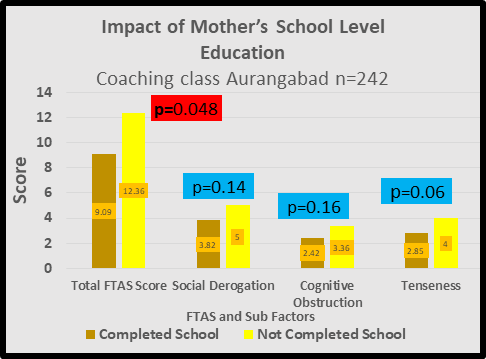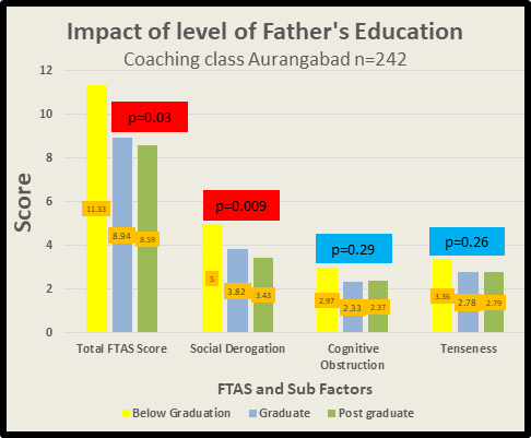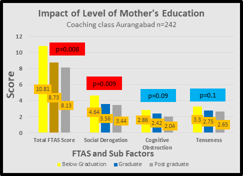 Some research has focused on these factors. In one study in China, they found out that, a mother’s education has a significant effect on both test anxiety and perceived parental pressure. The finding reflects the fact that mothers in China usually play a more important role than fathers in monitoring their children’s academic progress so children usually perceive more parental pressure from their mothers. This can be the reason for our study also. It can be discovered that the father’s occupation, mother’s occupation, mother’s education, and parents’ income have a significant impact on both test anxiety and perceived parental pressure. Chinese students perceive more parental pressure from their parents and thus are more stressed about test situations because their parents place greater importance on academic achievement as a means to achieve family glory, which results in constant involvement and monitoring of their children. As they want to improve economic conditions is the utmost important reason why parents constantly monitor their children’s academic progress.32 When both parents have a higher educational level, they value it and encourage good study habits, associate studying with financial independence, professionalism and are likely also able to provide real life examples of the benefits of prioritising studies.