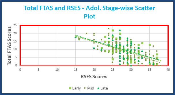 Table 8 shows that the Pearson correlations indicate moderate negative associations between RSES (Rosenberg Self-Esteem Scale) scores and total FTAS (Fear of Test Anxiety Scale) scores across most demographic segments. Significant negative correlations were observed consistently across gender groups, age brackets, and instructional mediums, except for male late adolescents and Marathi medium students. Highest negative correlation strength for female middle adolescents’ r (67) =.66, P<.001. In most cases, self-esteem and test anxiety show a strong reverse relationship. Of the three sub factors of FTAS, CO scores have the strongest relationship with RSES scores for most groups. Among male and female early adolescents, the negative correlations were moderate, with coefficients ranging from -0.41 to -0.59. In mid-adolescents, particularly among females, the negative correlations were stronger, ranging from -0.52 to -0.66, indicating a more pronounced relationship between self-esteem and test anxiety. The highest negative correlation was found among female mid-adolescents (r = -0.66, p < .001), suggesting a significant inverse relationship between self-esteem and test anxiety in this group (Figures 5–7).