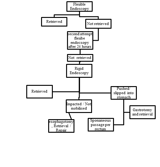 Various techniques like flexible endoscopy, rigid endoscopy, magnet, foley’s catheter, pushing the FB into stomach, gastrotomy, esophagotomy and thoracotomy have been done depending upon the situation (condition of child, esophagus, availability of equipments). Based on these procedures done for FB removal in neonates, suggested procedures/options are depicted in chart 2.