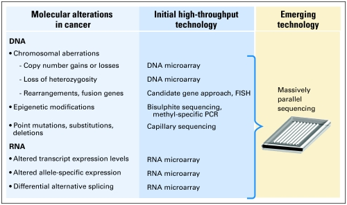 Genomic alterations that give rise to cancers occur at both the RNA and DNA level. Interrogation of the many types of changes and consequent pathway dysregulation has been restricted to date, in part as a result of limiting technologies. Massively parallel sequencing is one emerging technology that enables the myriad cancer-causing alterations to be interrogated on a tumor-by-tumor basis. FISH, fluorescent in situ hybridization; PCR, polymerase chain reaction.