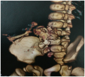 A 5 month old boy was admitted to Department of Pediatric Surgery, BSMMU on May 2017. At the age of 1 and half months, his parents noticed a lump in hislower abdomen. The lump is gradually increasing in size and is not painful. The boy has occasional vomiting but no other complains. The mother wasn’t on regular antenatal checkup however there was no history of any maternal illness, exposure to radiation or drug intake during pregnancy. There was no family history of multiple pregnancies. The boy was delivered by cesarean section as he was postdated. His postnatal period was uneventful. On clinical examination, there was a 10x10cm, well-defined, firm, non-tender, round mass occupying the right lumbar region, right iliac fossa, umbilical, hypogastric region and left iliac fossa. Laboratory investigations were within reference ranges. Alpha-feto protein was 36.25ng/ml (up to 15 ng/ml) and beta-HCG was 0.34mIU/ml (within normal range). Ultrasound of abdomen showed a large complex mass having solid, cystic components located on the lower abdomen. It measures about 10.6x9.0 cm. the mass is separated from right kidney. Also, in kidney, pelvicalyceal system are moderately dilated but cortex medulla are well defined. CT scan reported one fetus measuring about 12x11 cm is noted in the pelvic cavity and right lumber region having deformed skeleton within. The lesion is displacing the bowel, bladder and compresses the kidneys and ureters posteriorly. CT scan also reported moderate hydroureteronephrosis. A preoperative diagnosis of fetus in fetu with moderate hydroureteronephrosis was made (Figure 1 & Figure 2).