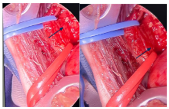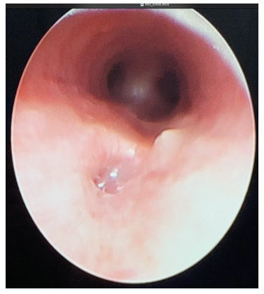 Surgical correction was decided, given the location of the fistula, a thoracotomy surgical approach was performed. Initially, the esophagus and trachea were identified, the esophagus was surrounded with vessel loops exposing the fistula, these were placed proximal and distal to the fistula delimiting it completely. (Figure 3). Tracheal plasty was performed on the posterior wall with continuous suture of PDS 5/0, hydrostatic test was realized without evidence of leaks, after which lateral tracheopexy was performed with 2 stitches of PDS 5/0 fixed to the thoracic spine. Finally, closure of the esophageal defect was performed in 2 planes: the first plane with continuous suture of PDS 5/0 and the second with separate invaginating stitches of PDS 5/0 and an orogastric tube was advanced, pneumatic test was performed without evidence of leaks. At 24 hours postoperatively, meets gasometric criteria, radiological and ventilatory parameter criteria for extubation, which was performed. Postoperative bronchoscopy and esophagogram were performed prior to the initiation of the oral route, reported an intact suture without refistulization, confirming the success of the surgical repair and the stability of the airway. The patient was discharged tolerating the oral route by suction and low flow oxygen supply.