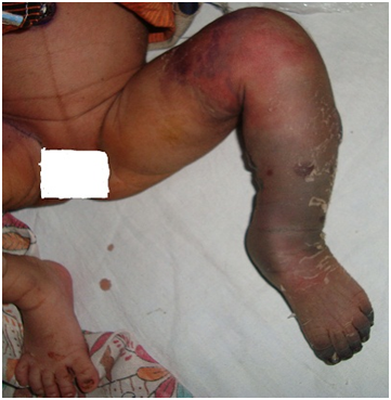 At admission, intravenous antibiotics (cefotaxime and piperacillin) and subcutaneous low molecular weight heparin was started. Orthopaedic consultation was done for progressive gangrene of left lower limb on day three of admission and patient was subjected to disarticulation at left knee joint on day four based on extent of gangrene as judged by orthopaedic colleagues. Baby was well in postoperative period and discharged after ten postoperative days.