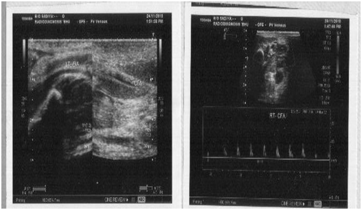 His hemogram revealed Hb: 10.8 gm/dl, TLC:15,000/mm3, DLC: N76,L20,E3,M1 and Platelet: 140,000/mm3. His renal and liver function tests were normal. There was no evidence of hemolysis in peripheral smear with reticulocyte count less than 0.5% and negative coomb’s test. His c-reactive protein was 0.91 mg/L (non-significant) and aerobic blood culture was sterile. Prothrombin and activated partial thromboplastin time were normal. Test for anti-cardiolipin antibodies [IgG:6 GPLU/mL(N:<10), IgM MPLU/mL(N:<10) and anti-thrombin III:24.4mg/dL (normal range:19-39 mg/dL) were negative. Serum protein-C was 77.8% of normal (deficiency<if less than 60%) and protein-S: 91.7% (deficiency<if less than 70%) was within normal limit. Factor V mutation analysis revealed no abnormality. Colour Doppler study of lower limb showed uncompressible common iliac vein with echogenic lumen and no evidence of flow, suggestive of left common iliac vein thrombosis, extending up to superficial femoral vein (Figure 2).