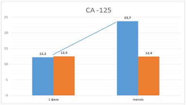 The age of women ranged from 21 to 27 years. In a prospective study, we managed in 41 women with endometriotic ovarian cysts to diagnose twice the oncomarkers of CA-125 (in the 1st phase and during menstruation), and twice the measurement of the antimuller hormone before and after surgical treatment. The ratio of indicators of the level of CA-125 during menstruation to the indicator during the follicular phase of the cycle exceeded 1.5 times the average normal values, which indicated the presence of endometriosis during ultrasound verification (Figure 1). It should be noted that among 41 patients in 9 (22.4%) patients, the endometriotic cyst was not verified by ultrasound due to the small shape (diameter less than 2.5-3cm). In outpatient practice, a gynecologist faces a difficult question regarding the routing and management tactics of such patients, especially if there is an acute issue of pregnancy. The surgical approach for endometriotic ovarian cysts is generally consistent with that for any benign ovarian tumor. In the treatment of our patients of reproductive age, the most important was the preservation of fertility. At the same time, all the principles of microsurgical surgery were not always observed in all hospitals using the gentle effects of modern surgical energies on the ovarian tissue (enucleation of only the affected areas) to maximize the preservation of the ovarian reserve.