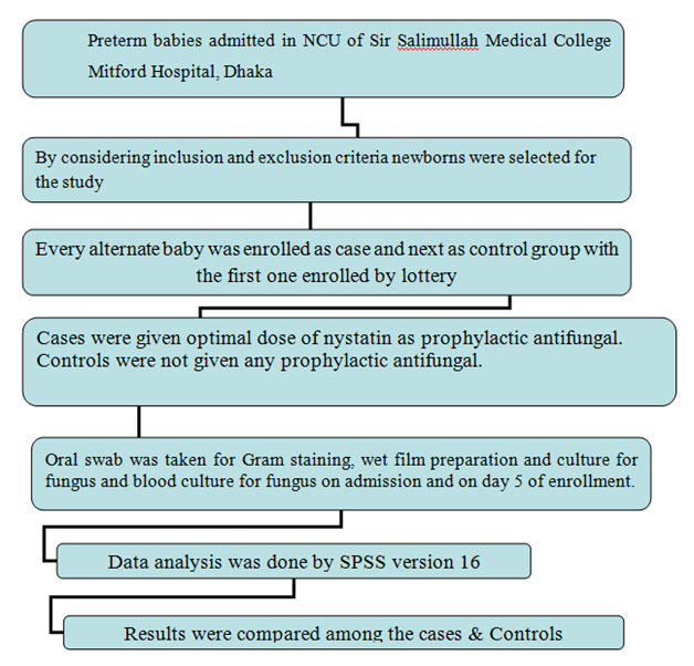 In Bangladesh either oral Nystatin or systemic Fluconazole is commonly being used to treat oral thrush and to prevent fungaemia in newborns. However, the efficacy of the Nystatin has not yet been tested in Bangladeshi preterm babies. Data are scarce in this field. This prospective interventional study has been carried out to find the efficacy of oral Nystatin in reducing colonization of fungus and fungaemia in preterm LBW babies in NCU of Sir Salimullah Medical College & Mitford Hospital, Dhaka (Figure 1).