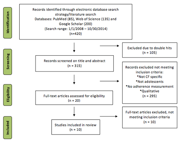 A total of 420 hits, 315 of which were unique, resulted from the initial electronic database searches. After screening the title and abstract, 295 of the studies were excluded because they were not specific to cystic fibrosis, included age categories outside of adolescence, did not analyze treatment adherence and/or challenges to adherence or were qualitative in nature. Of the remaining 20 records, the full text was obtained and assessed for inclusion for review. Ten more studies were excluded based on poor sample size, use of qualitative methods for analysis, or because they included only adults or children (or mean age under 11 years old). Finally, a total of 10 studies were agreed upon and met all inclusion criteria (Figure 1).