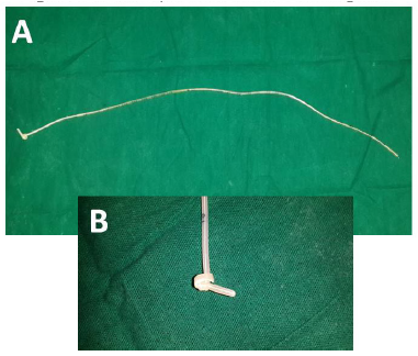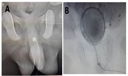 An eight months male infants, admitted in Pediatric department for evaluation of fever, poor feeding and lethargy of 3 days. Evaluation was performed, including complete blood cell count, blood culture, chest radiograph, and direct catheterization for urinalysis and culture using a 5 Fr feeding tube. The nurse performing catheterization reported that she was unable to remove the catheter after insertion. Pelvis roentgenogram showing a true knot in the catheter in posterior urethra (Figure 1A). Pediatric surgeon opinion was asked, on examining along the urethra, the knotted catheter could be palpated at the perineum. Several attempts at forceful introduction of sterile saline and contrast material under fluoroscopy failed to unwind the loop. Under general anesthesia another attempt was made to untie the knot and straighten the catheter with 3F ureteric catheter stylet through the catheter lumen. Failing this maneuver catheter was pushed in to bladder from posterior urethra with the help of ureteric catheter stylet (Figure 1B) Knotted feeding tube removed by minimal invasive technique from the bladder. The bladder was filled with normal saline through feeding tube, A 5 mm laparoscopic port was introduced in the bladder in the suprapubic region and knotted feeding tube identified. A 6-7.5 Fr ureterorenoscope was introduced through the laparoscopic port and catheter (Figure 2A and B) was removed under vision after cutting the feeding tube at penile end. After port site closed Foley catheter was inserted and was left in place for 3 days. Urinalysis showed evidence of a urinary tract infection which improved with intravenous antibiotics. Post operative course was uneventful. The child had been passing urine in good stream in follow up.