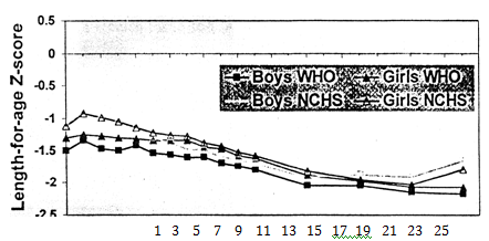 During fetal life and the first two years after birth, nutritional requirements to support rapid growth and development are very high. Average height for age scores are already low at birth in several regions and decline sharply during the first 24 months of life, but they show no further decline or any improvement ultimately leading to short stature.