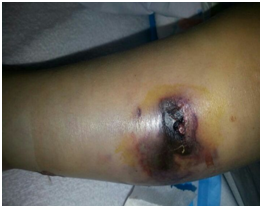 A three year old female patient, previously healthy, who presented to the Quarantine hospital, Beirut, Lebanon after being bitten with a snake two days previous. The girl was in the family garden in Akkar when a black snake bit her on the upper third of the lateral side of her left leg. The parents applied a tourniquet around the girl’s leg, excised the wound and suctioned the venom. However, when the girl’s leg became swollen and edematous, she was admitted to a hospital in Akkar, where she received two doses of anti-venom and tetanus vaccine. The patient started to vomit and her leg worsens so she was transferred to the Quarantine hospital after three days of antibiotics treatment with no improvement but deterioration.